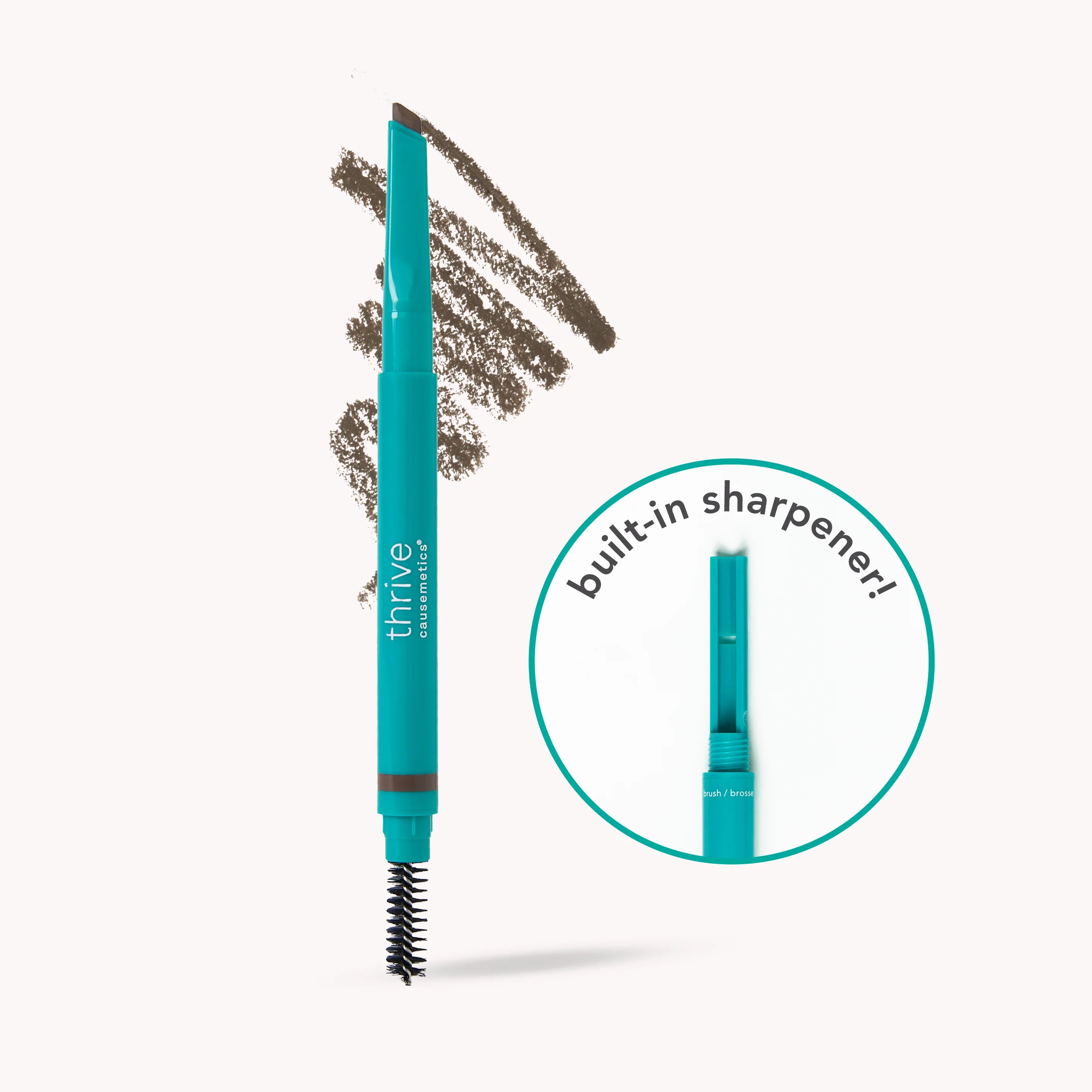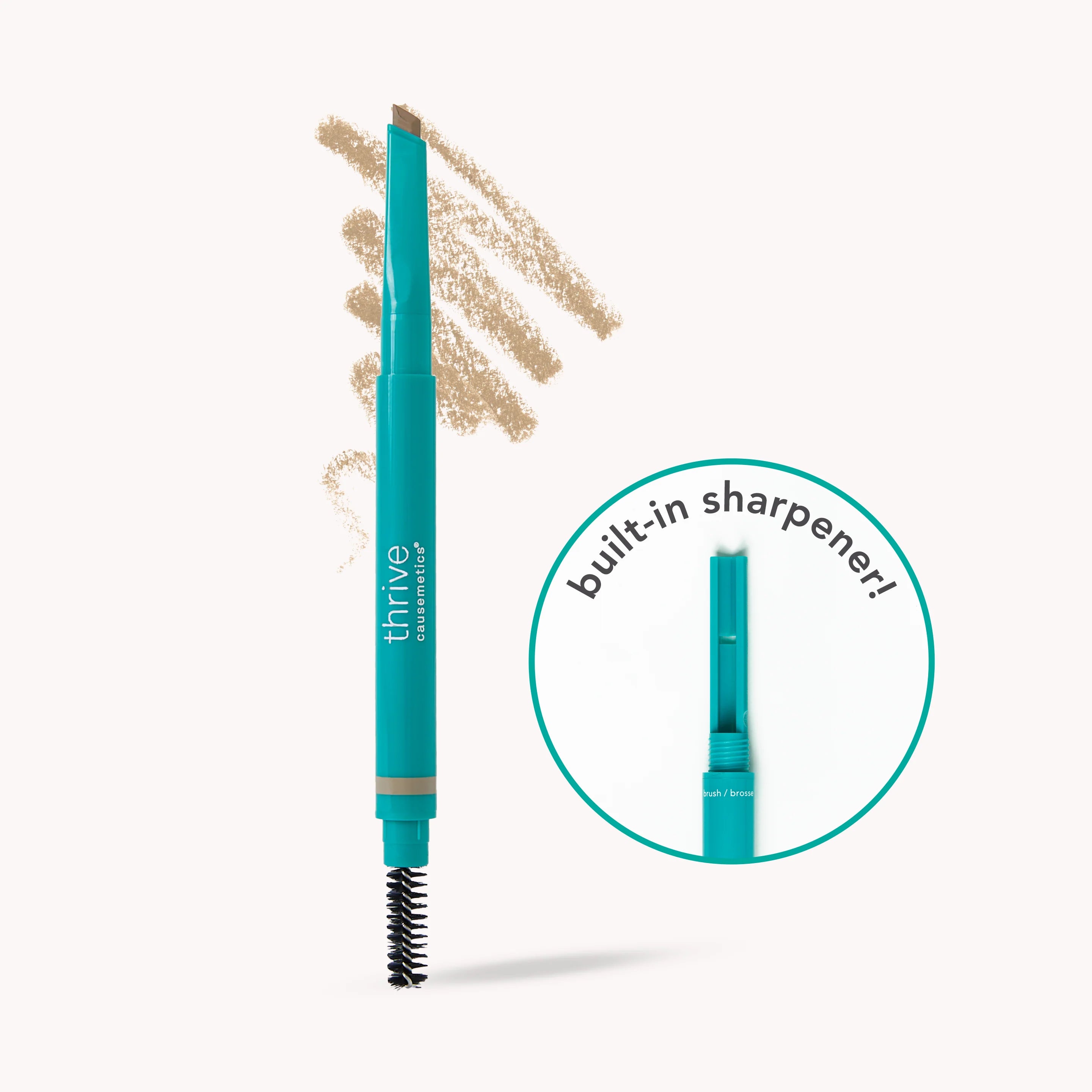 To Sharpen: Twist entire brush section counter-clockwise to reveal a built-in sharpener. Hold the pencil at a 45° angle and lightly glide the tip back and forth to refine the blunt edge. Avoid applying too much pressure to prevent breakage. Tap off shavings and securely screw the sharpener back into place before enjoying your freshly sharpened tip!